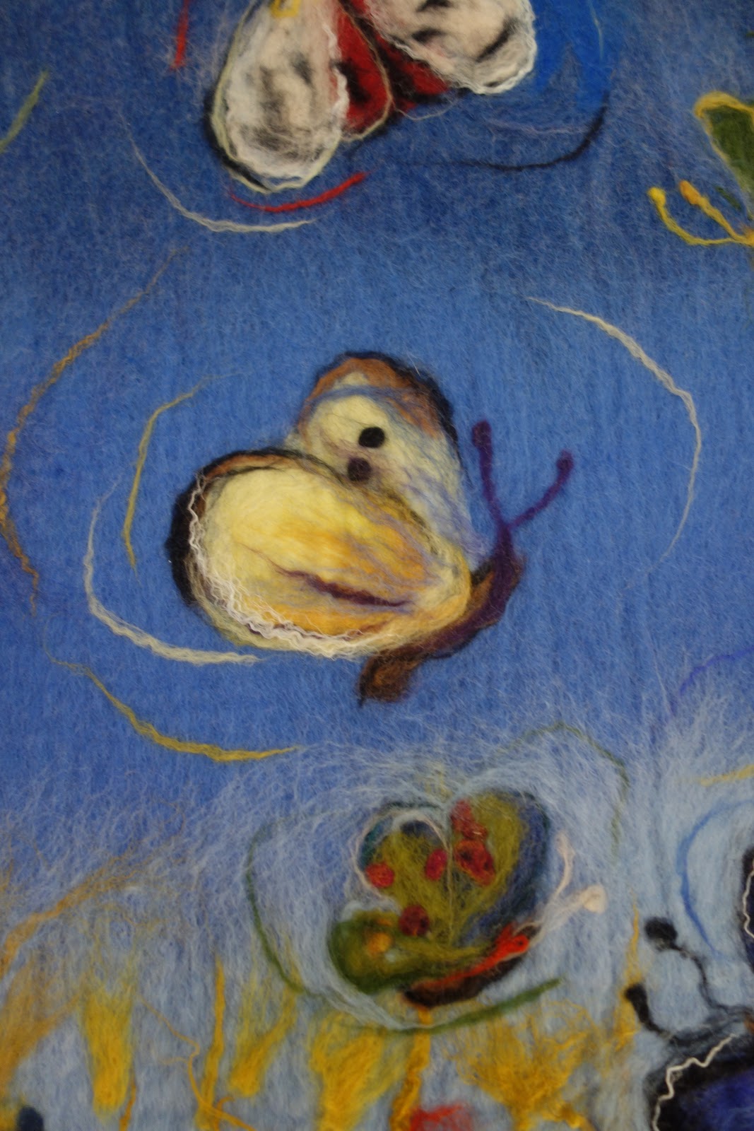 sarah was displaying her felt pictures and hangings at Prema in Uley so I trotted along. She is a very gifted artist who studied fine art at Portsmouth, and shared a studio with Alice Kettle.